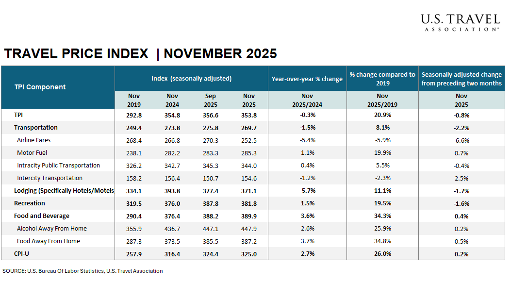 Research Monthly Insights Travel Price Index MONTHLY INSIGHTS December 18, 2025 The Travel Price Index (TPI) tracks the cost of travel in the United States using U.S. Department of Labor data from the monthly Consumer Price Index (CPI). Released monthly, the TPI is comparable to the CPI while focusing on travel-related expenses. Key Insights Although October data was not released, the November CPI showed only a small increase for overall price levels from September and remained in check year over year. Travel prices decreased on both a monthly and annual basis. Notably, the government shutdown affected data collection and reporting for the period. The CPI grew 0.2% over two months and 2.7% year over year, below September’s 3.0% and in line with trends for much of 2025. Travel prices fell, with TPI down 0.2% from September and 0.8% from November 2024. Category Highlights Price decreases across multiple travel components kept inflation contained for the TPI. Airfares showed significant price declines across short- and long-term periods. After rising over the summer, airline fares decreased 6.6% in November relative to September and 5.4% compared with the same time last year. Hotel prices also decreased and have been trending slightly down for much of the year. In November, they were down 1.7% compared with September and 5.7% below November 2024, when prices had spiked. Gas prices moderated to a 0.7% increase in November after a 4.0% jump in September but remained relatively stable for the year, up 1.1% versus November 2024. Recreation costs fell 1.6% for the month but remain 1.5% above last year’s levels. Prices at bars and restaurants rose slightly faster than the CPI overall and remain the only TPI components with inflation higher than the overall economy. Explore additional data and insights via the U.S. Travel Insights Dashboard. Travel Price Index (TPI) September 2025 Travel Price Index (TPI) August 2025 Travel Price Index (TPI) July 2025 Travel Price Index (TPI) June 2025 Travel Price Index (TPI) May 2025 Travel Price Index (TPI) April 2025 Member Price: $0 Non-Member Price: $0 Become a member to access.